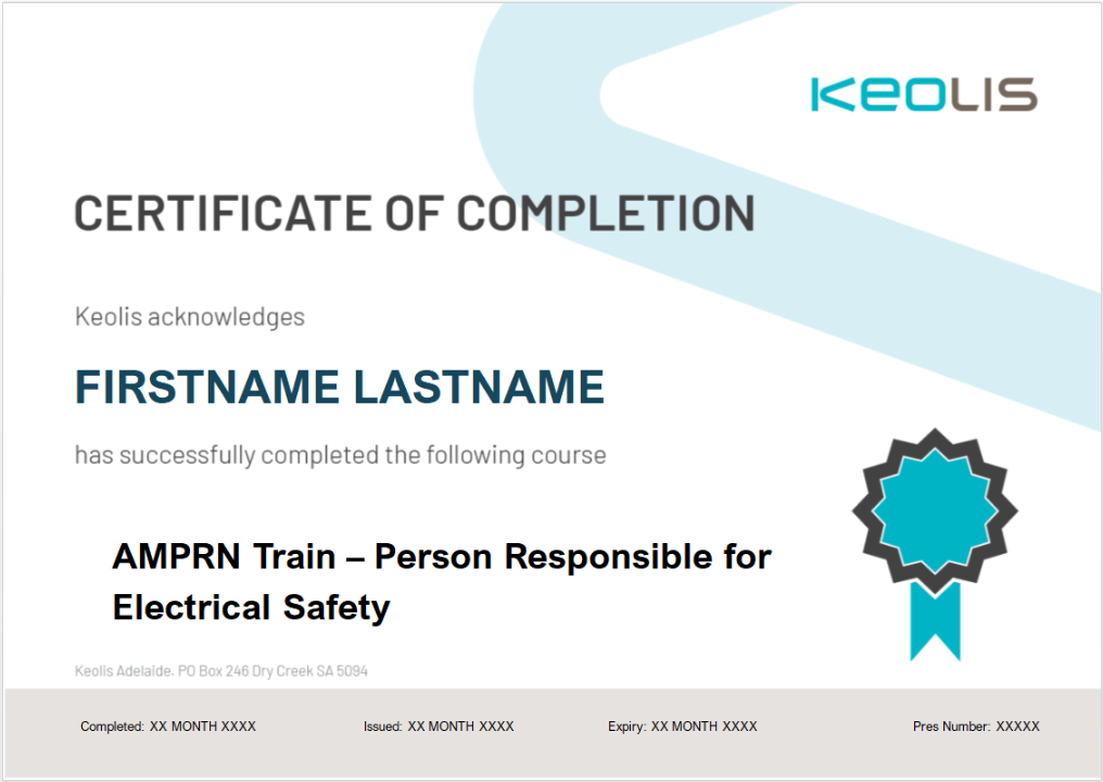 Send feedbackStatement of Completion.AMPRN Train - Person Responsible for Electrical Safety (PRES) (KDAw0020)