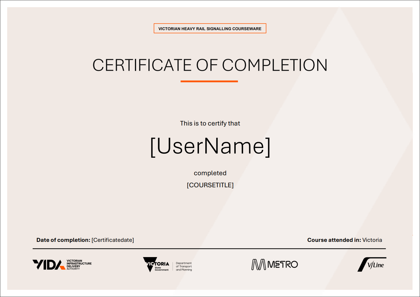 Send feedbackCertificate of Completion.VIC - Signalling Competencies (GROUPED RULE)