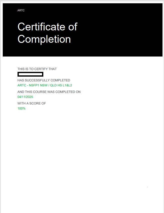 Certificate.ARTC - NSFP1 NSW / QLD HS L1&L2 & PO3 (63225)