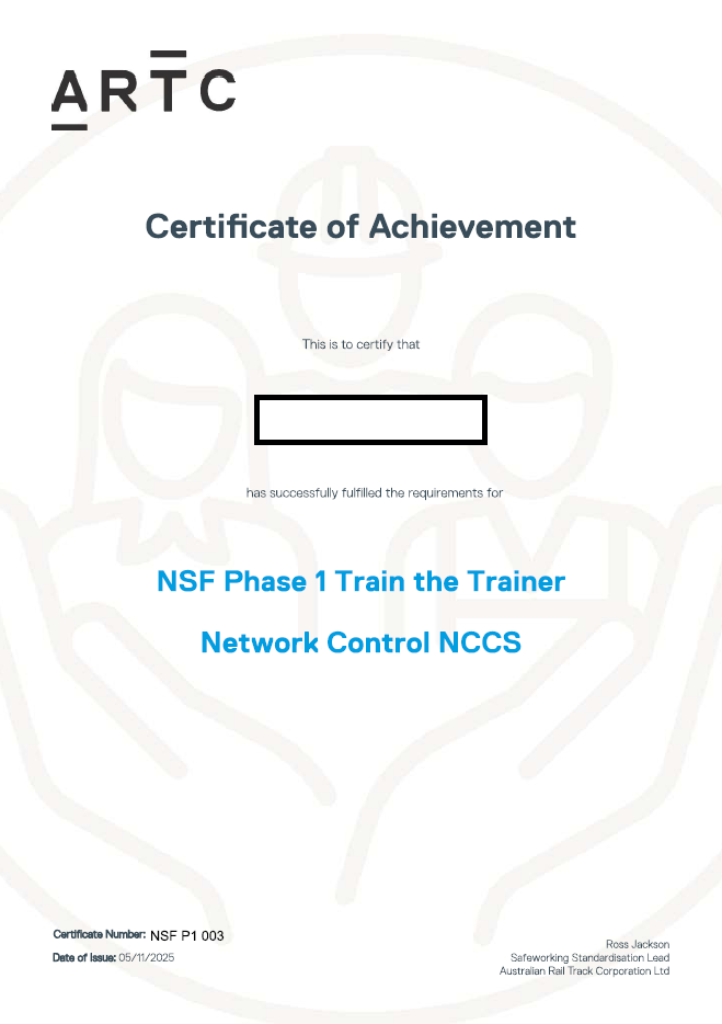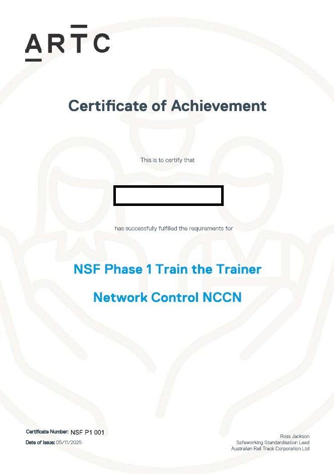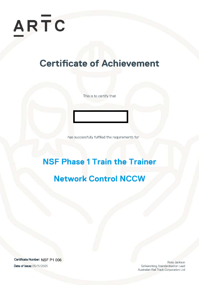 Certificate.ARTC - NSF Phase 1 Train the Trainer Network Control NCCW (63622)