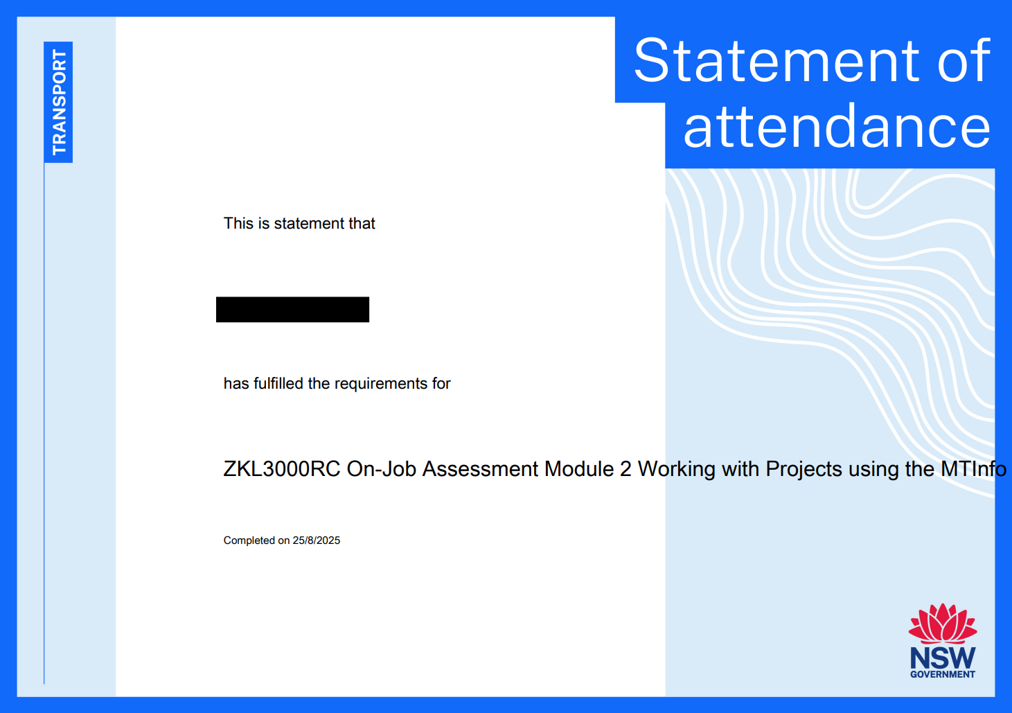 Send feedbackStatement of Attendance.TfNSW Assess Corridor Safety Proof of Face-to-Face Attendance (83962 or 64557)