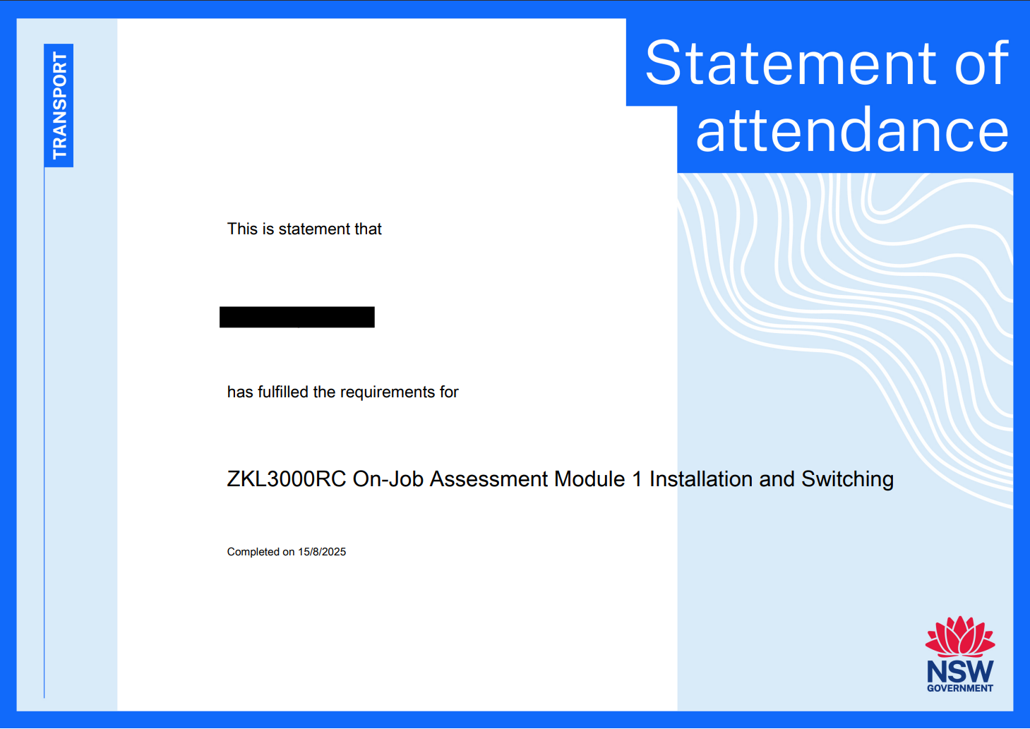 Send feedbackReference.TfNSW Statement of Attendance - ZKL3000RC Installation and Switching (Module 1) (78527)