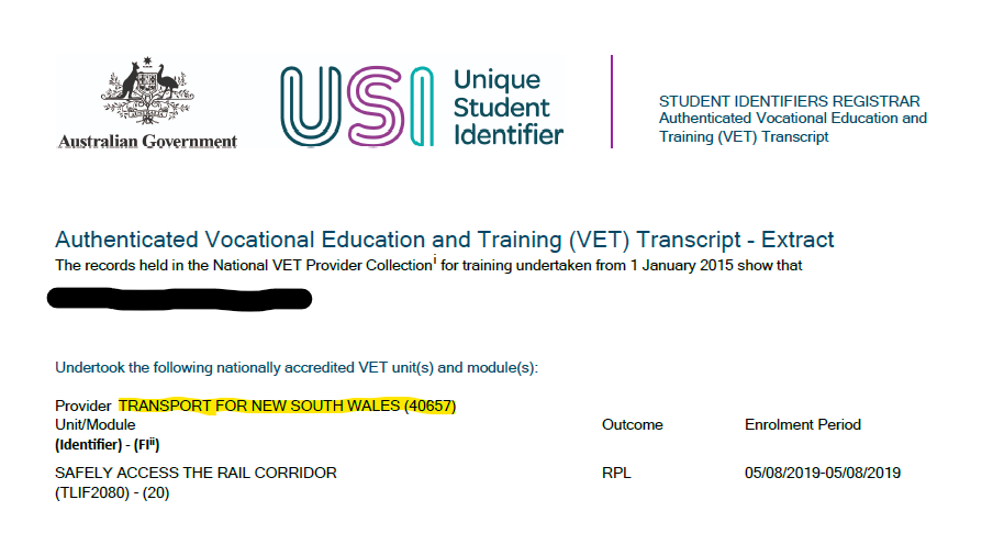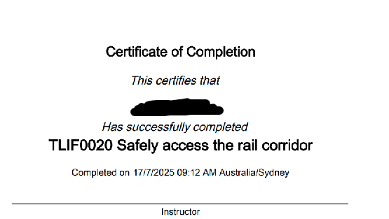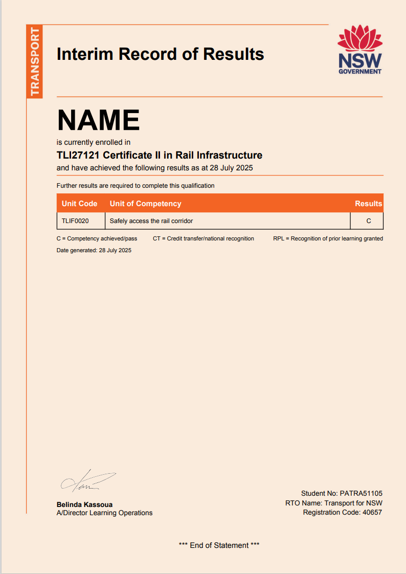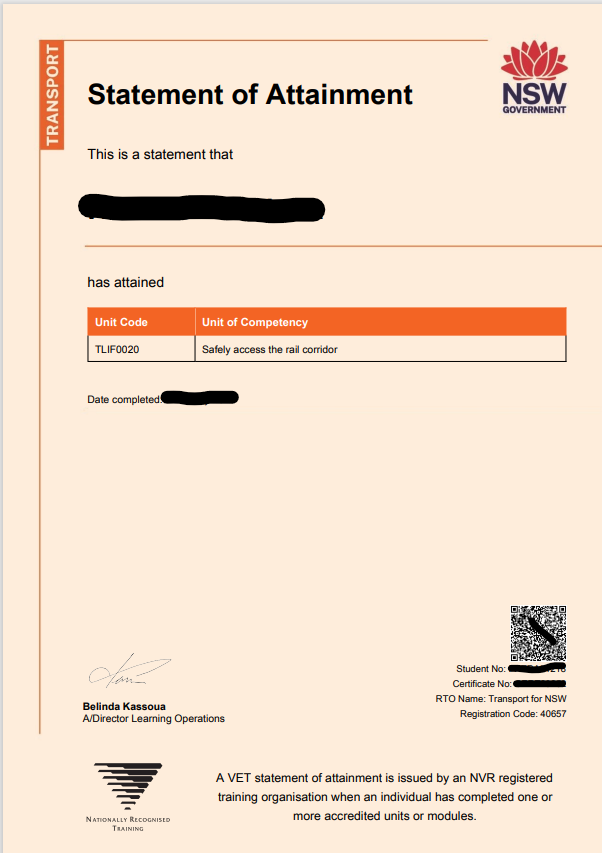 Send feedbackStatement of Attainment.TfNSW - Safely Access Rail Corridor (43929 or 52274)